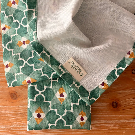 Damasco destaca por su equilibrio entre tradición y diseño, un estampado geométrico que aporta carácter sin resultar recargado. Sus verdes profundos, combinados con pequeños acentos dorados y burdeos, crean un juego visual elegante que viste la mesa con naturalidad y presencia. Perfecto para quienes buscan un estilo cuidado que combine con distintas vajillas y ambientes.