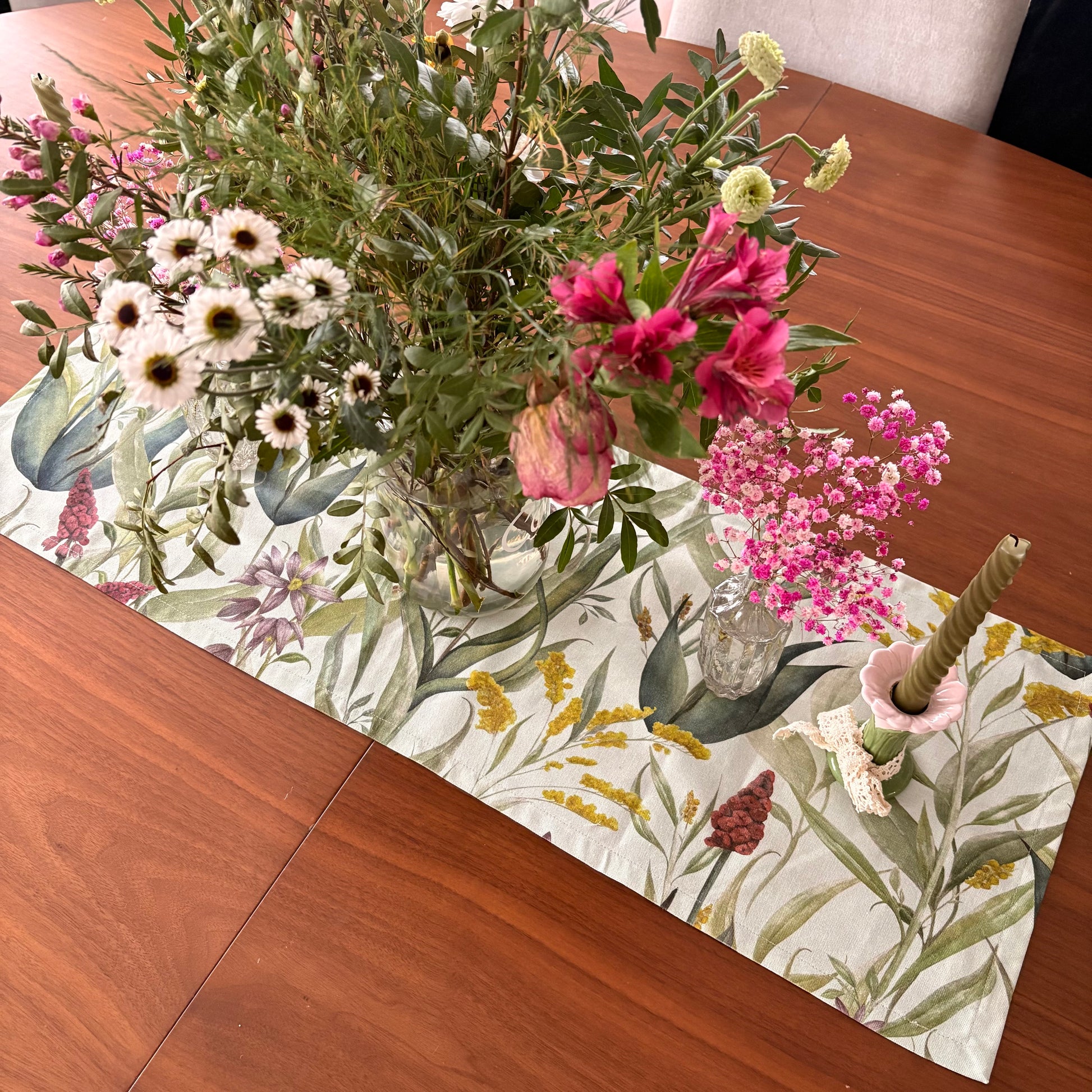 Casilda es un estampado botánico sereno y envolvente que viste la mesa con naturalidad y carácter. Hojas estilizadas en tonos verdes que se mezclan con flores silvestres en tonos mostaza, burdeos y malva. Elegante pero cercano, es un diseño atemporal que invita a disfrutar de la sobremesa.